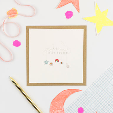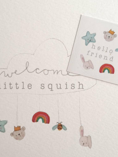 A gender neutral frameable greetings card to welcome a little squish into this mad world! Cute little characters hang from a fluffy cloud - origina...
