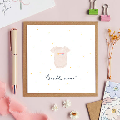 A cutie little gender neutral card to celebrate a new arrival Leanbh nua translates as new baby Designed to be framed after gifting Blank for your ...