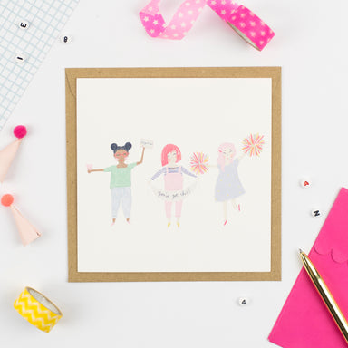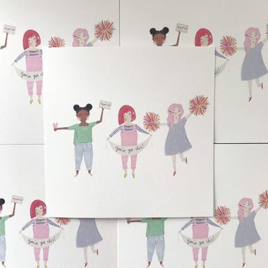 Who runs the world? Girls! Your crew is behind you, cheering you on. Original mixed media illustration printed on beautifully textured card Blank...