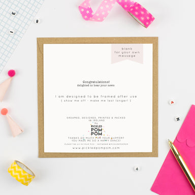 Translates as Congratulations - delighted to hear your news Blank for your own expression of joy, reverse shows translation A lovely way to mark a...