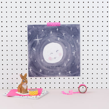 Digital illustration printed on a beautifully textured 250gsm card Charming Illustration of a smiling Mister Moon looking down from a starry night...